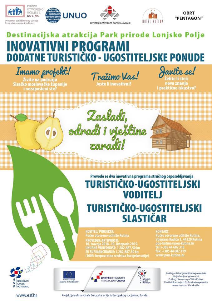 „Budući da je glavni problem koji rješavamo projektom niska razina praktičnih znanja, vještina i općih kompetencija osoba za rad u turizmu/ugostiteljstvu, te nedostatak praktičnog osposobljavanja u realnim uvjetima, shodno potrebama tržišta rada SMŽ, apeliram na sve koji su nezaposleni, a mlađi su od 25 godina i stariji od 54 godine, te osobe s invaliditetom da se jave u kutinsko Pučko učilište, informiraju o projektu, o benefitima osposobljavanja i tako osnaže svoju priliku za zapošljavanje na tržištu rada te steknu nove vještine i poznanstva“, poručila je Jelena Crnac, voditeljica projekta.