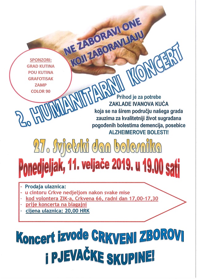 Koncert će se u organizaciji Povjerenstva za promicanje glasa svetosti brata Ivana Bonifacija Pavletića, a u povodu 27. Svjetskog dana bolesnika, održati u ponedjeljak, 11. veljače 2019. godine u 19,00 sati u Kino dvorani POU Kutina. Izvođači će biti Crkveni zborovi i pjevačke skupine sa područja grada Kutine.